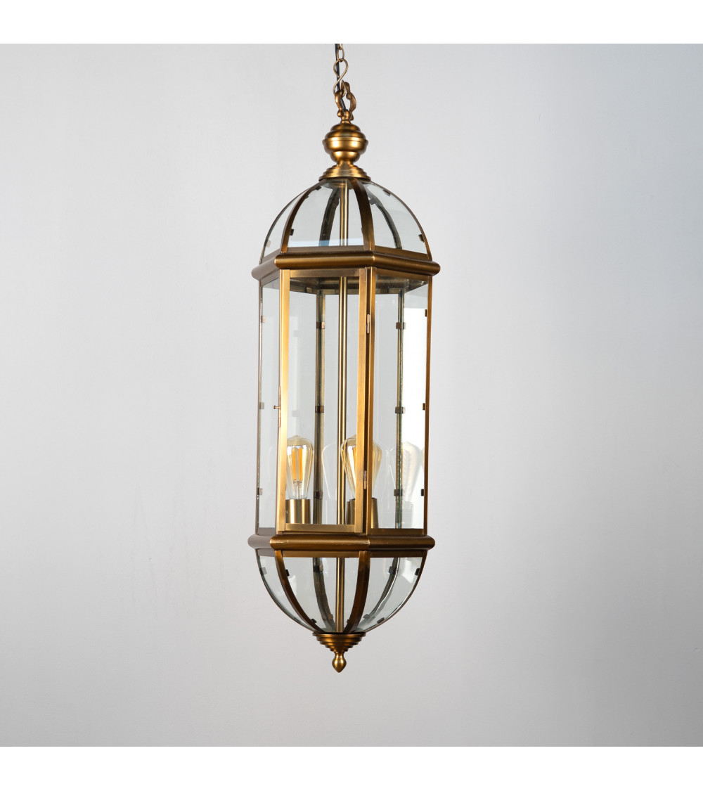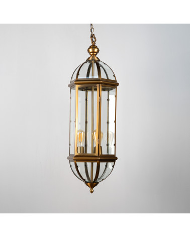Art decò style chandeliers available in two sizes, realized with brass iron frame and glass.